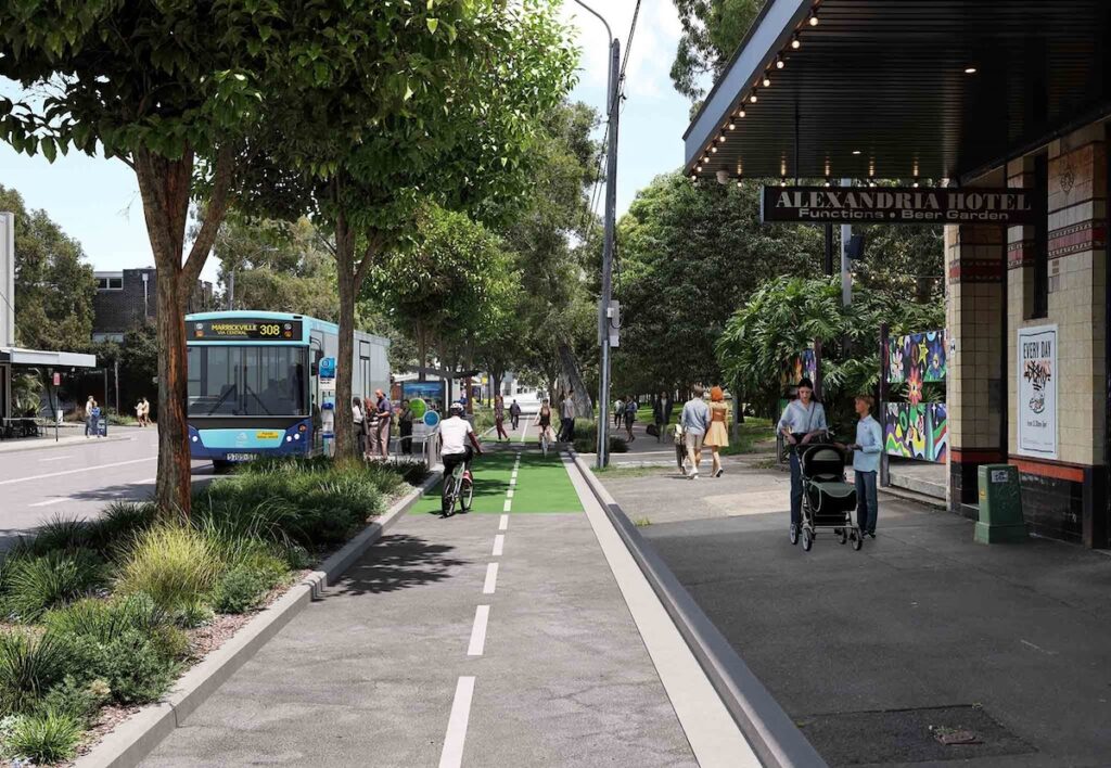 Existing bus services will continue to operate along the route, with the design including a new platform beside the cycleway west of Garden Street. The proposal also reserves space for a future bus stop near Waterloo Metro station to meet passenger demand.