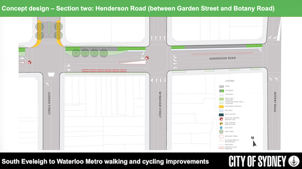 The City of Sydney is proposing to build a two-way cycleway along the northern side of Henderson Road and Raglan Street to link existing bike routes with the Waterloo Metro station. Council planning documents state that the project aims to create safer cycling routes and improve walking conditions along busy local roads.